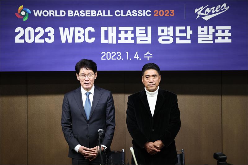 4일 오후 서울 강남구 야구회관에서 이강철 야구대표팀 감독과 조범현 기술위원장이 2023 월드베이스볼클래식(WBC)에 출전하는 한국 야구대표팀 선수 명단을 발표하고 있다. (사진=연합뉴스 제공)