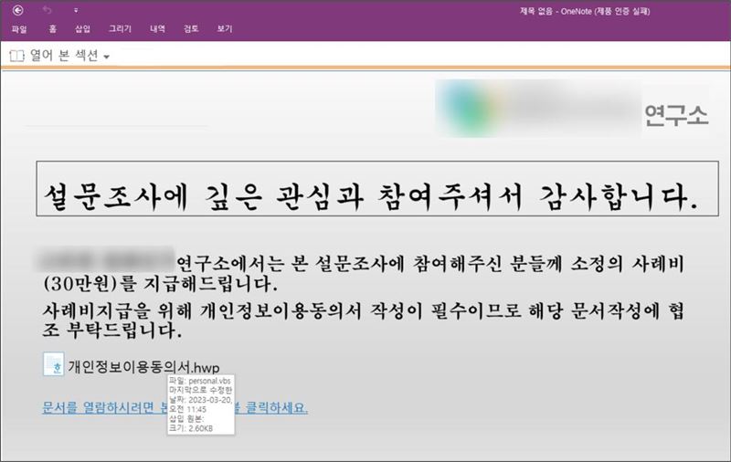 20일 안랩[053800]에 따르면 김수키는 한 연구소가 진행한 설문 조사에 참여해 감사하다며 사례비 30만원을 지급한다는 문서를 원노트를 통해 유포하고 있다.