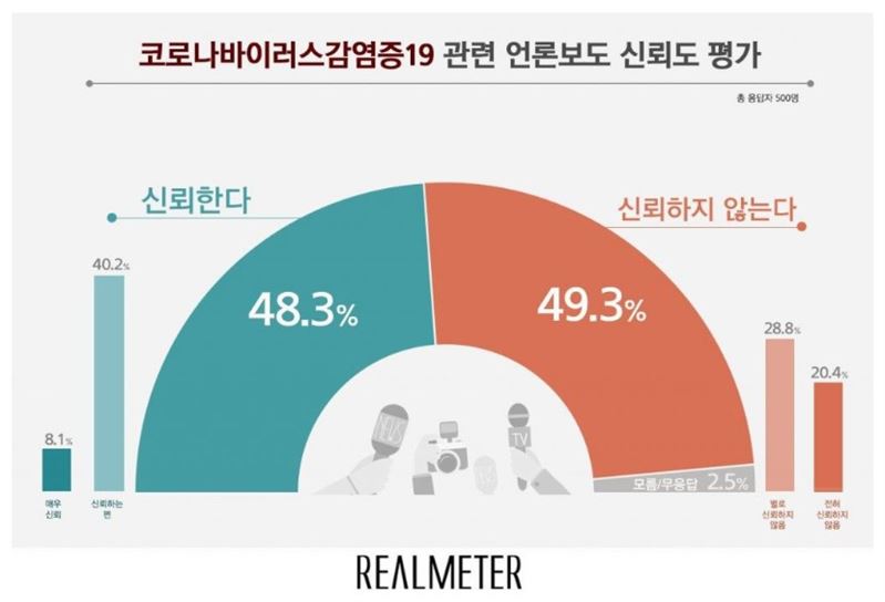 지난 2020년 3월19일 리어미터 자료. 코로나19 관련 언론 보도, 신뢰 안 함 49.3% vs 신뢰함 48.3%