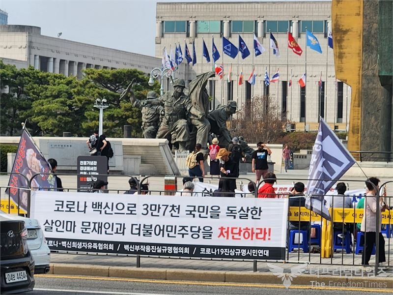 매주 토요일 서울 용산구 소재 전쟁기념관 조형탑 앞에서 코로나19·백신 유가족 피해자 단체 연합 집회를 하고 있다. (사진=더프리덤타임즈)