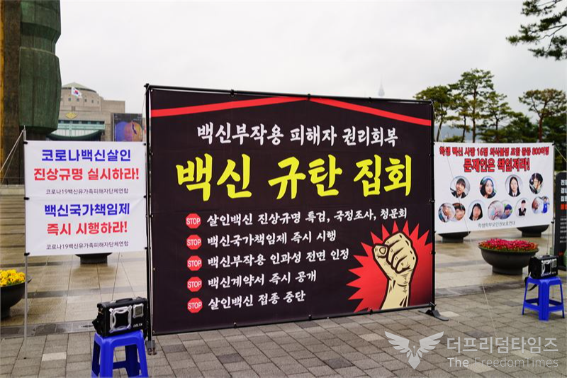 코로나19·백신 희생자 유가족 및 피해자들이 매주 토요일 2시 이곳에서 집회를 하고 있다. 사진=더프리덤타임즈