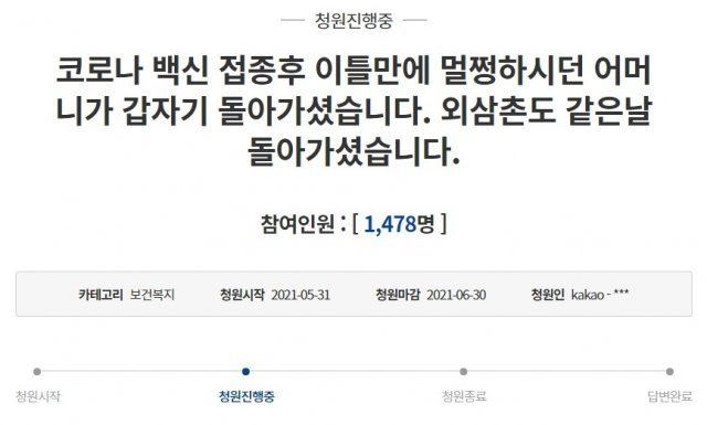 지난 2021년 5월31일 코로나19 화이자 백신을 접종한 고령자가 사망해 유족이 청와대 국민청원을 통해 정부의 후속 조치에 대한 불만을 토로했다. (사진=청와대 국민청원 캡처)