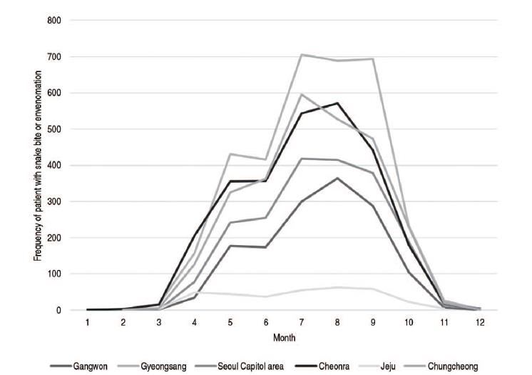 뱀물림으로 응급실 찾은 환자들의 지역별, 계절별 현황. 전국에서 7~9월에 환자가 집중돼 있다. (논문 발췌)