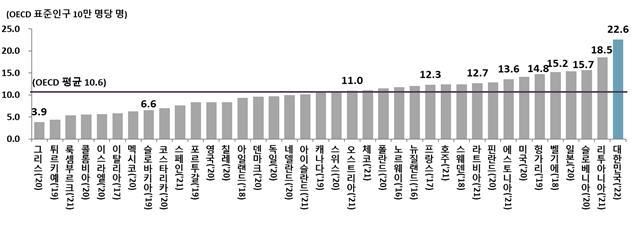 자살률은 감소했지만 OECD 회원 38개국 중에서는 여전히 가장 높다. 한국의 OECD 표준인구 10만명당 자살 사망자 수는 22.6명으로 회원국 중 유일하게 20명을 웃돌았다.