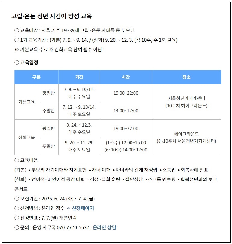 서울시는 2025년 고립·은둔 청년 지킴이 양성 교육 사업을 확대, 약 1천 명의 가족과 주변인을 지원해 청년의 일상 회복 안전망을 구축한다.