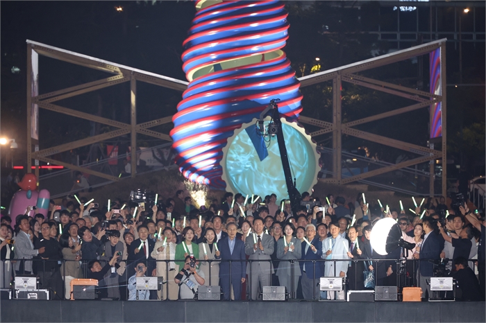이명박 전 대통령과 오세훈 서울시장이 1일 청계광장에서 열린 '청계천 복원 20주년 행사'에서 새로운 공공미술 작품의 점등 버튼을 누르고 있다.사진=연합뉴스