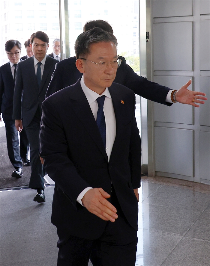 정성호 법무부 장관이 1일 오후 부산 연제구 부산검찰청 청사에 들어서고 있다. 뒤에는 이날 정 장관을 영접 나온 부산 고검·지검 간부들. 이날 정 장관은 부산 고검과 지검을 찾아 검사들과 간담회를 가졌다.사진=연합뉴스