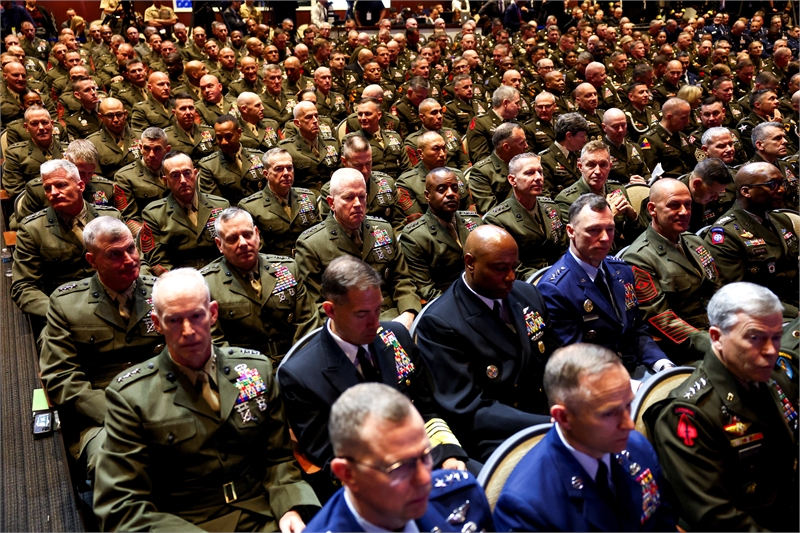 지난달 30일 본토로 소집돼 대통령과 국방장관 연설 듣는 미 지휘관들.사진=연합뉴스