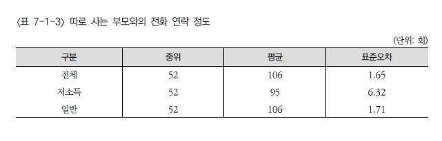 연구팀은 "왕래에서는 저소득 가구가 일반 가구보다 접촉 빈도가 높았던 반면, 전화 연락에서는 반대였다"면서도 "다만 저소득 가구에서 표준오차가 크게 나타나 저소득 가구 간 부모와 접촉 빈도의 편차가 크다"고 분석했다.