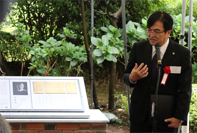 일본 도쿄 릿쿄대에서 11일 열린 시인 윤동주 기념비 제막식에서 니시하라 렌타 릿쿄대 총장이 인사말을 하고 있다.사진=연합뉴스