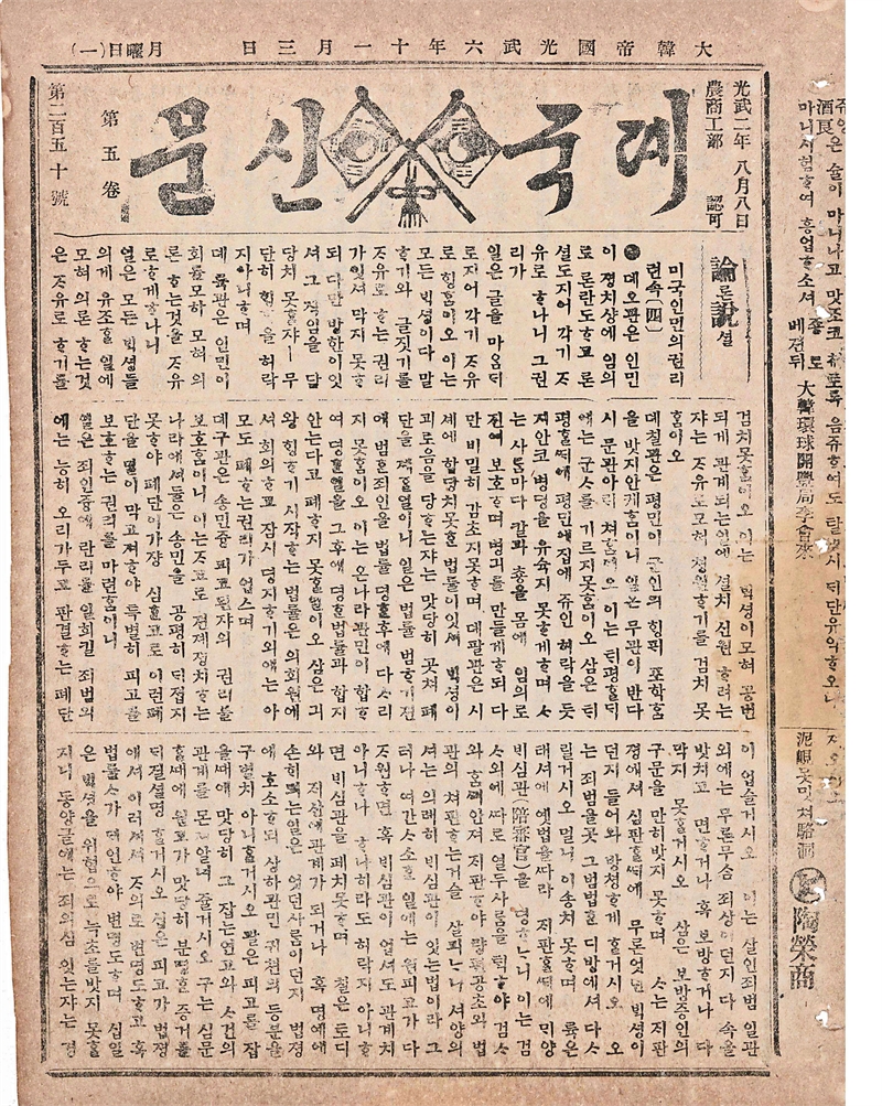 대한제국 광무 6년(1902년) 11월3일 월요일 제국신문 원문 일부.사진=연합뉴스