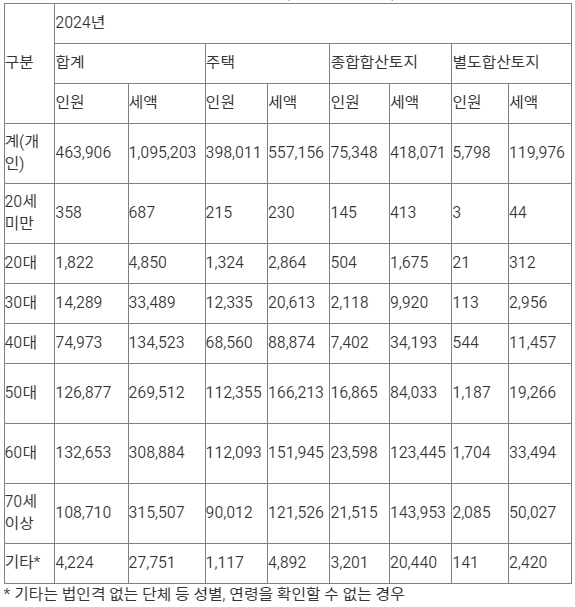 60대는 13만2천653명, 70세 이상은 10만8천710명이 납부했으며, 1인당 평균 종부세액은 60세 이상이 259만원으로 60세 미만(203만원)보다 많았다.