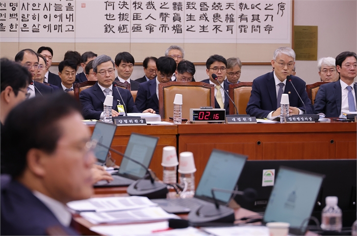 천대엽 법원행정처장이 13일 서울 여의도 국회에서 열린 대법원 등에 대한 법제사법위원회 국정감사에서 의원 질의에 답변하고 있다.사진=연합뉴스