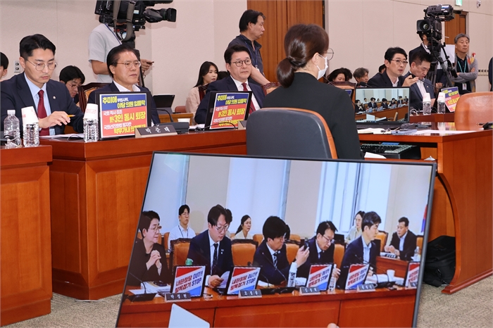 22일 국회 법제사법위원회에서 열린 '건진법사 관봉권 띠지' 분실 관련 검찰개혁 입법청문회에서 국민의힘 주진우 의원이 행정안전위원회에서 피켓을 내건 더불어민주당 의원들의 모습이 담긴 사진을 공개하며 추미애 법사위원장의 질서유지권 발동에 대해 비판하고 있다.사진=연합뉴스