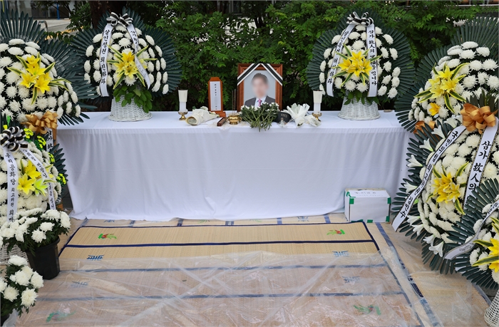 13일 민중기 특별검사팀 사무실이 있는 서울 광화문 KT웨스트빌딩 앞 인도에 '양평 공흥지구 특혜 의혹'과 관련해 수사받다 숨진 채 발견된 양평군 공무원 A씨의 분향소가 마련돼 있다. 이 분향소는 전날 신자유연대와 국민의힘평당원협의회 관계자들이 설치했다.사진=연합뉴스