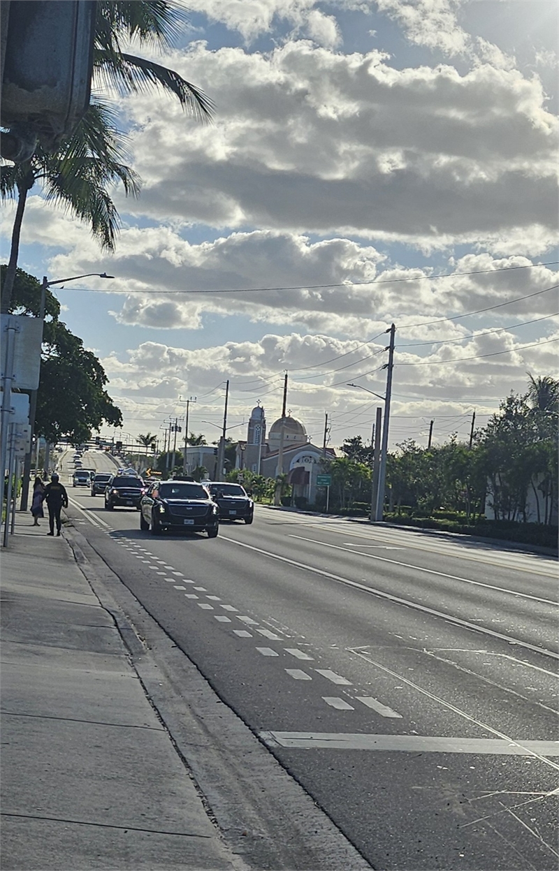 18일(현지시간) 웨스트팜비치의 트럼프 인터내셔널 골프클럽에서 진행되는 한국·일본·대만 기업인들과의 골프 회동을 위해 마러라고 리조트에서 골프장으로 이동 중인 트럼프 대통령의 차량 행렬. .사진=연합뉴스