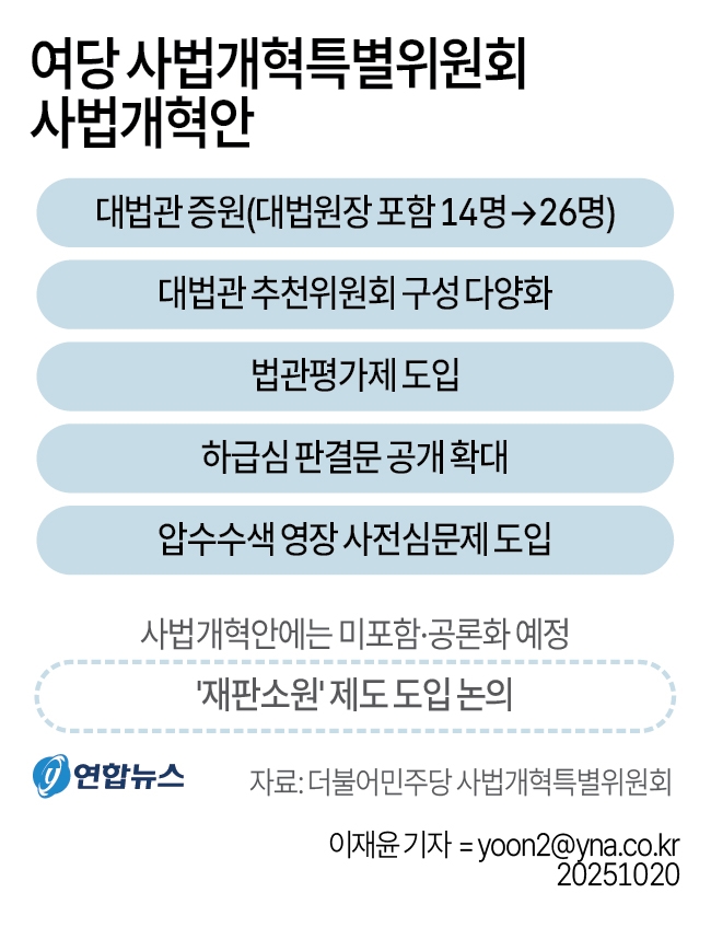 더불어민주당 사법개혁특별위원회(사개특위)는 20일 현재 14명인 대법관 수를 26명으로 대폭 늘리는 내용을 골자로 하는 '사법개혁안'을 발표했다.