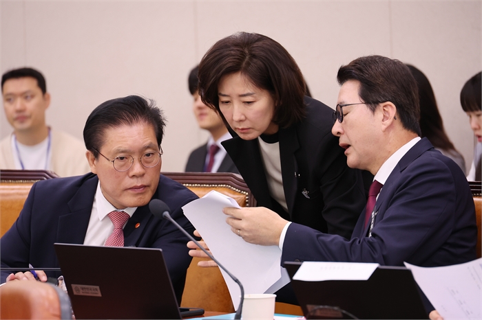 국민의힘 송석준, 나경원, 신동욱 의원이 21일 서울 여의도 국회 법제사법위원회에서 열린 국정감사에서 대화하고 있다.사진=연합뉴스