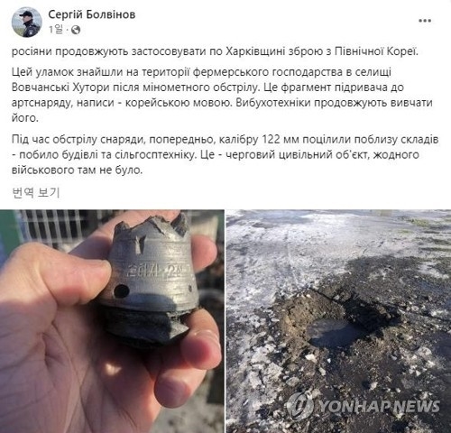 러시아가 북한산 무기를 사용하고 있다는 주장이 꾸준히 제기되는 가운데 러시아군이 우크라이나로 발사한 무기에서 또다시 한글이 발견됐다. 세르게이 볼피노프 우크라이나 하르키우 경찰국 수사국장은 지난 2024년 2월14일(현지시간) 자신의 페이스북에 "러시아가 하르키우 지역에서 북한 무기를 계속 사용하고 있다"며 증거 사진을 공개했다.사진=세르게이 볼피노프 우크라이나 하르키우 경찰국 수사국장 페이스북 캡처/연합뉴스