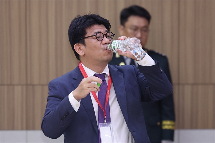 22일(현지시간) 캄보디아 프놈펜 주캄보디아 대사관에서 열린 국회 외교통일위원회 주캄보디아·주베트남·주태국·주라오스대사관 국정감사에서 김현수 주캄보디아 대사 대리가 물을 마시고 있다.사진=연합뉴스