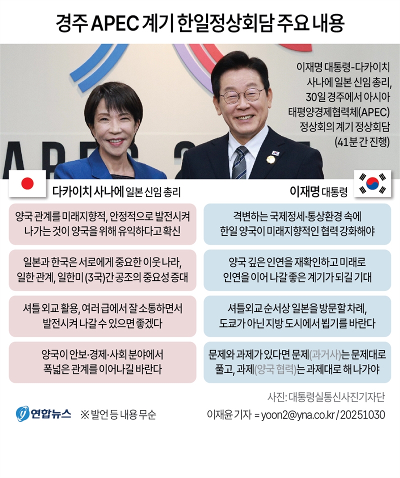 이재명 대통령은 30일 경주에서 아시아태평양경제협력체(APEC) 정상회의를 계기로 방한한 다카이치 사나에 일본 신임 총리와 정상회담을 했다. 이번 회담은 다카이치 총리 취임 9일 만에 이뤄진 양국 정상의 첫 대면으로, 경주 화백컨벤션센터에서 오후 6시 2분부터 41분간 진행됐다.사진=연합뉴스