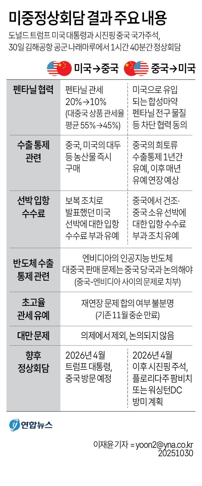 30일 김해공항 열린 미중 정상회담에서 미국은 중국을 상대로 시행 중인 합성마약 펜타닐 관련 징벌적 세를 기존의 20%에서 10%로 낮추고, 중국은 희토류 수출 통제를 1년간 유예하기로 했다. 중국이 매우 민감하게 받아들이는 양안 문제(대만-중국 문제)는 논의 테이블에 올라오지 않는 등 이날 정상회담의 의제는 주로 무역과 경제 이슈에 집중된 것으로 전해졌다.사진=연합뉴스