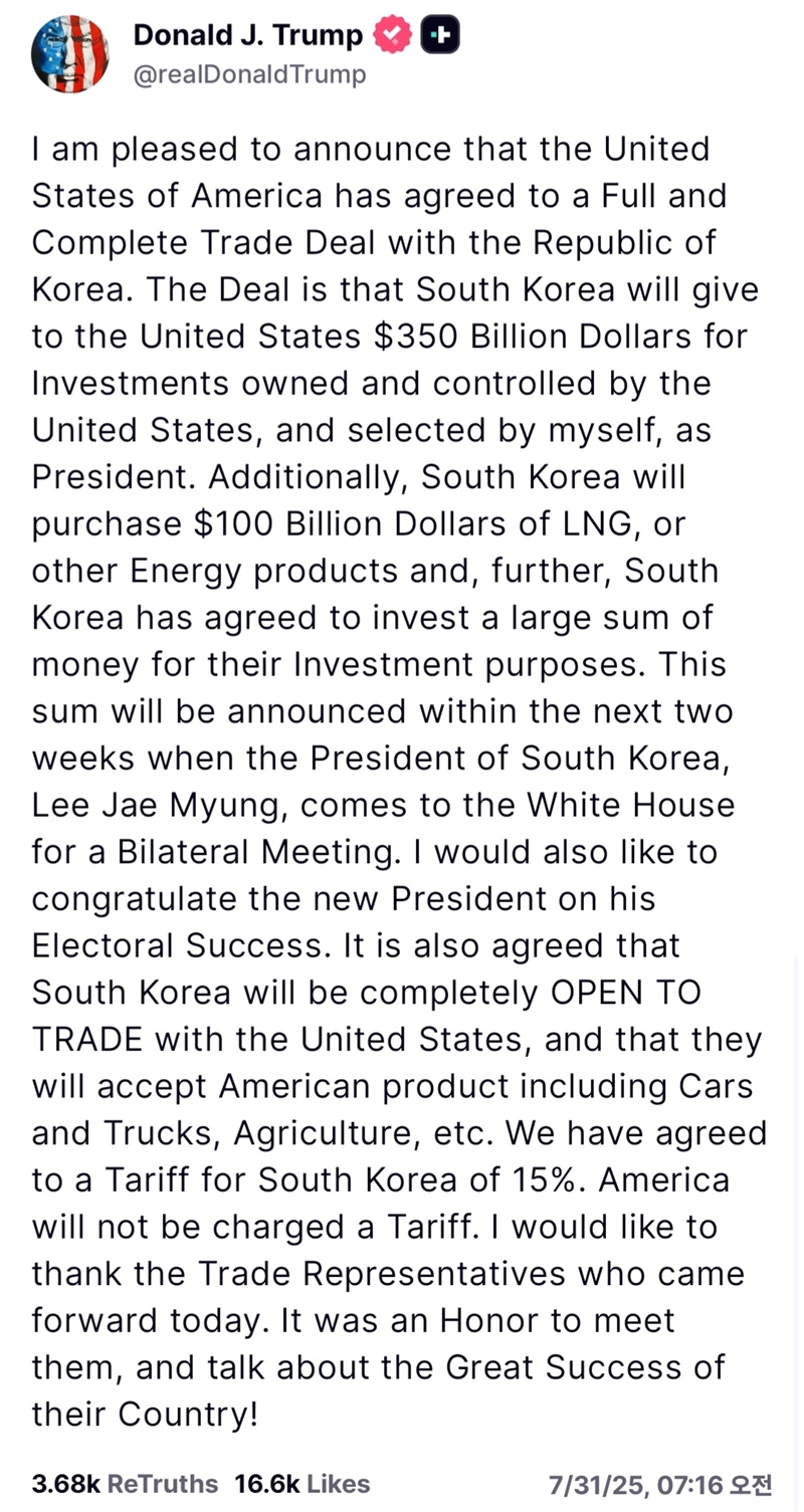 도널드 트럼프 미국 대통령이 지난 10월30일(현지시간) 자신의 소셜미디어에 게시한 한미무역 협상 타결 게시글.사진=트루스소셜