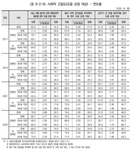 비장애인 중 '우울 등으로 인한 대화 상대가 필요할 경우 도움 요청 대상이 없다'고 답한 비율은 19.5퍼센트(%)였으나, 장애인 중 해당 비율은 33.3퍼센트(%)에 달했다.