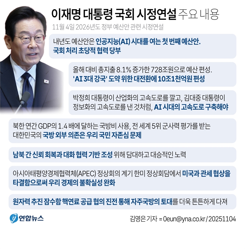 이재명 대통령은 4일 "내년도 예산안은 바로 인공지능(AI) 시대를 여는 대한민국의 첫 번째 예산안"이라며 국회 처리에 대한 초당적 협력을 당부했다. 이 대통령은 이날 국회에서 가진 시정연설에서 "내년은 'AI 시대'를 열고 대한민국의 새로운 100년을 준비하는 역사적 출발점"이라며 이같이 밝혔다.사진=연합뉴스