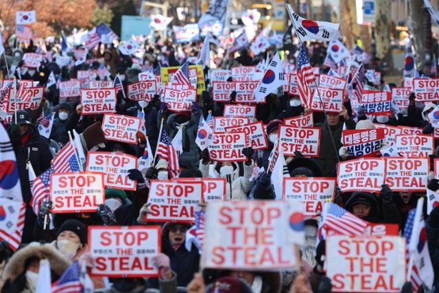 윤석열 대통령 탄핵 심판 5차 변론기일인 지난 4일 오후 서울 종로구 헌법재판소 인근 안국역 5번 출구 앞에서 열린 탄핵각하 촉구 집회에서 대통령 지지자들이 피켓을 들고 부정선거를 규탄하는 구호를 외치고 있다.사진=뉴시스 캡처