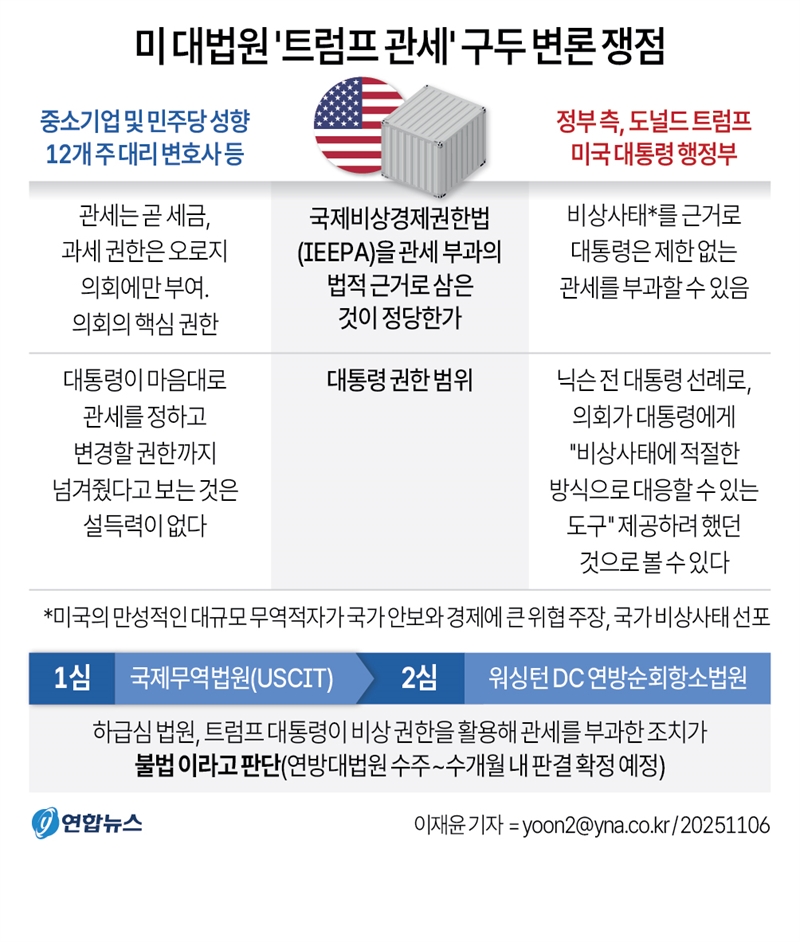이날 워싱턴 디시(Washington D.C.) 대법원 청사에서 약 3시간가량 진행된 이번 관세 소송의 구두 변론에서는 정부 측 대리인과 소송을 제기한 중소기업 및 민주당 성향의 12개 주(州)를 대리하는 변호사들이 치열한 법정 공방을 펼쳤다.