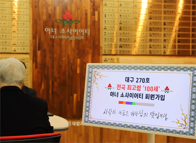 신홍식 대구사회복지공동모금회장은 “백세 어르신의 가입은 단순한 기부가 아니라 세대를 초월한 감동의 메시지”라며 “국가 발전과 함께 걸어온 한 세기의 생애를 ‘나눔’으로 완성하신 뜻깊은 결정에 진심으로 경의를 표한다”고 밝혔다.