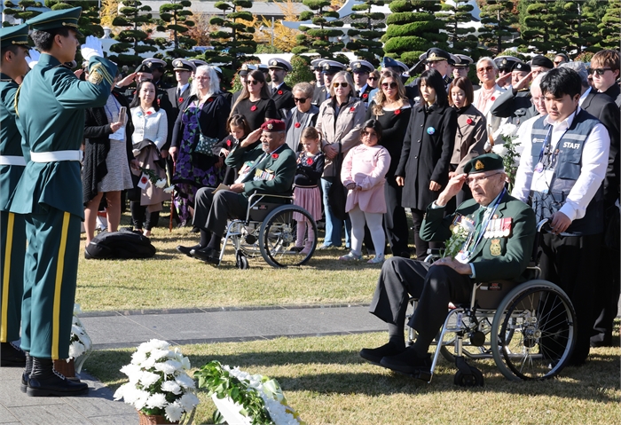 11일 부산 남구 유엔기념공원에서 열린 '턴 투워드 부산, 제19회 유엔참전용사 국제추모의 날 기념식'에 앞서 캐나다 유엔군 참전용사와 유가족, 후손, 외교사절 등이 전우가 잠든 묘역을 찾아 참배하고 있다.사진=연합뉴스