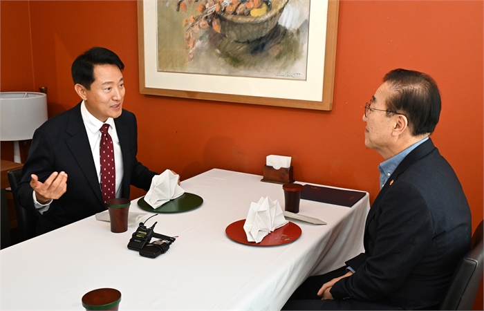 오세훈 서울시장이 13일 서울 중구 달개비에서 김윤덕 국토교통부 장관과 오찬에 앞서 환담하고 있다.사진=연합뉴스