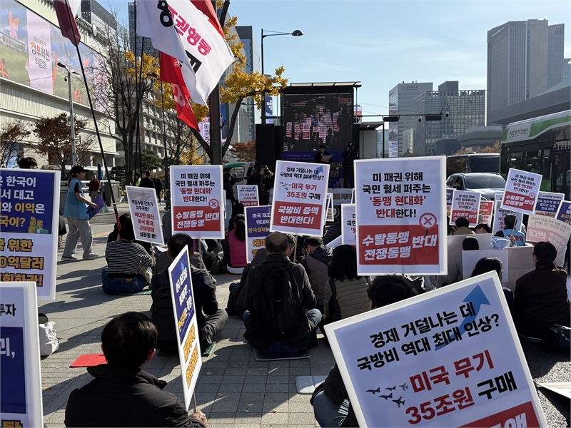 종로구 광화문 의정부터 앞에서는 진보성향 시민단체들로 구성된 트럼프위협저지공동행동이 집회를 열어 한미 관세·안보협상 체결을 비판했다.