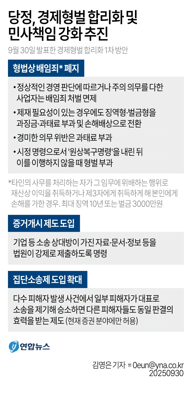 더불어민주당과 정부는 지난 9월30일 배임죄가 과도한 경제 형벌로 작용해 기업의 정상적인 경영 판단을 어렵게 만든다고 보고 형법상 배임죄를 폐지하는 방향으로 가닥을 잡았다고 밝혔다.사진=연합뉴스
