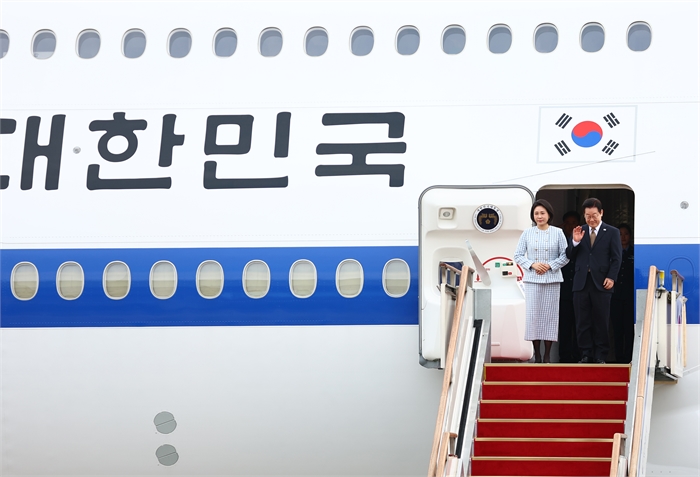 이 대통령은 환송 인사들과 가벼운 대화와 악수를 나누며 김 여사와 함께 공군 1호기에 탑승했다.