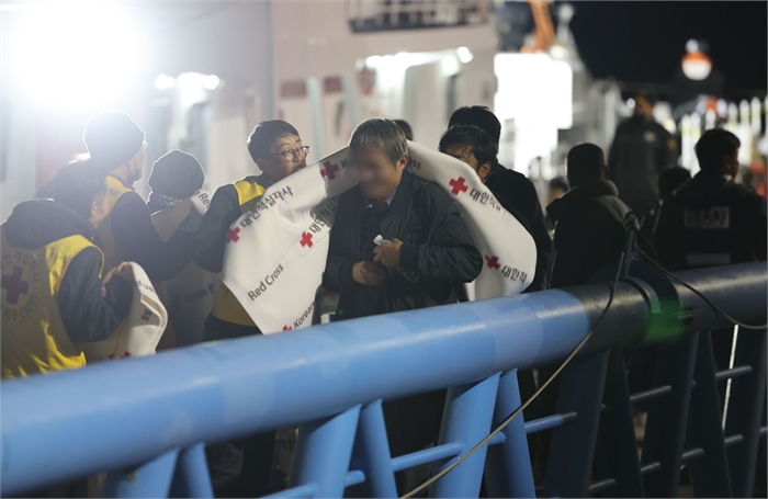 지난 19일 오후 전남 목포시 목포해양경찰서 전용 부두로 여객선 퀸제누비아2호 탑승객들이 구조돼 놀란 가슴을 쓸어내리며 이동하고 있다. 267명이 탑승한 퀸제누비아2호는 이날 오후 8시 17분께 전남 신안군 장산도 남방 족도에 좌초됐다.사진=연합뉴스