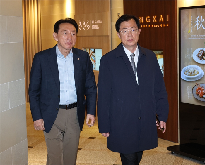 국민의힘 김석기, 이만희 의원이 20일 장동혁 당대표와 3선 의원들의 오찬 회동을 위해 서울 여의도의 한 식당으로 들어가고 있다.사진=연합뉴스