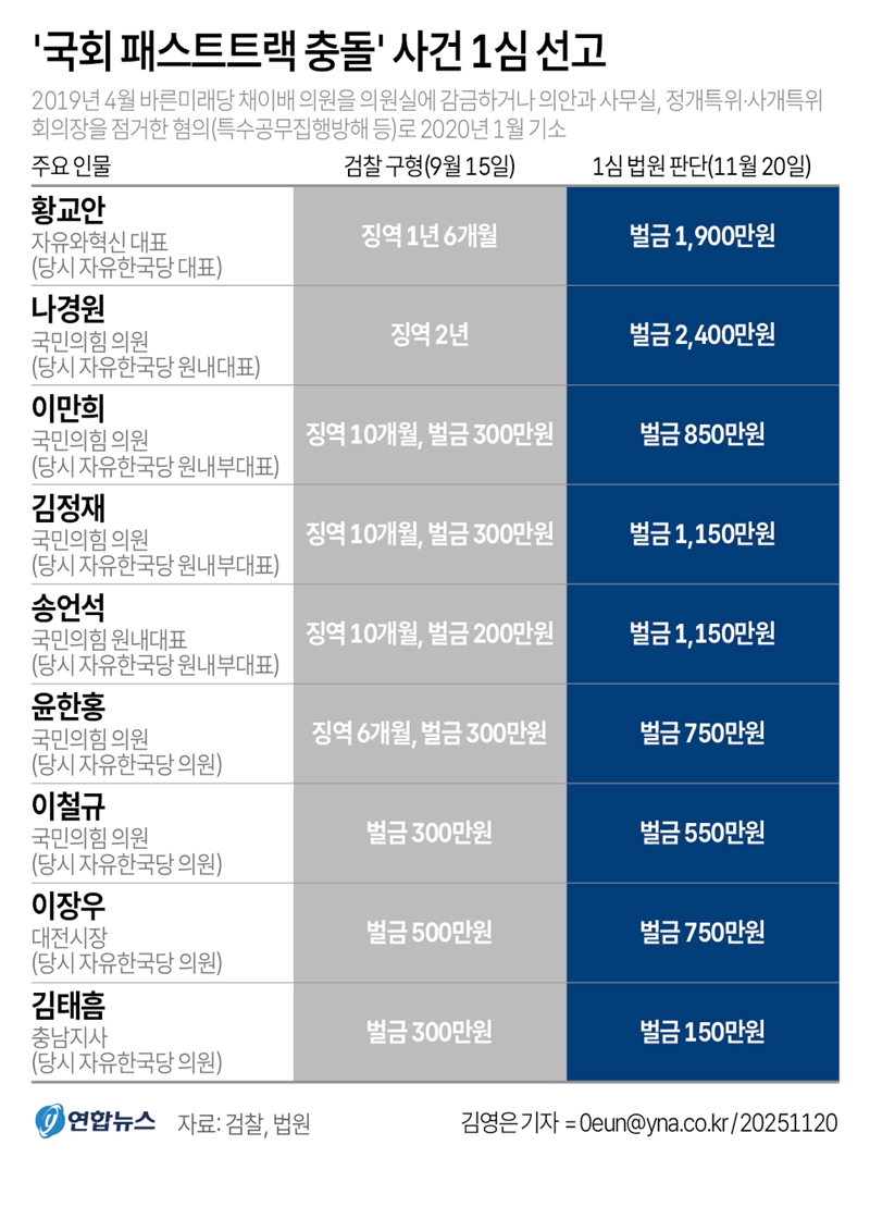 '국회 패스트트랙 충돌'에 연루된 국민의힘 전현직 의원들이 1심에서 모두 벌금형을 선고받았다. 서울남부지법 형사합의11부(장찬 부장판사)는 이날 오후 2시 특수공무집행방해 등 혐의로 기소된 국민의힘 나경원 의원과 황교안 전 국무총리 등 자유한국당(국민의힘 전신) 관계자 26명에 대한 선고 공판을 열었다.사진=연합뉴스
