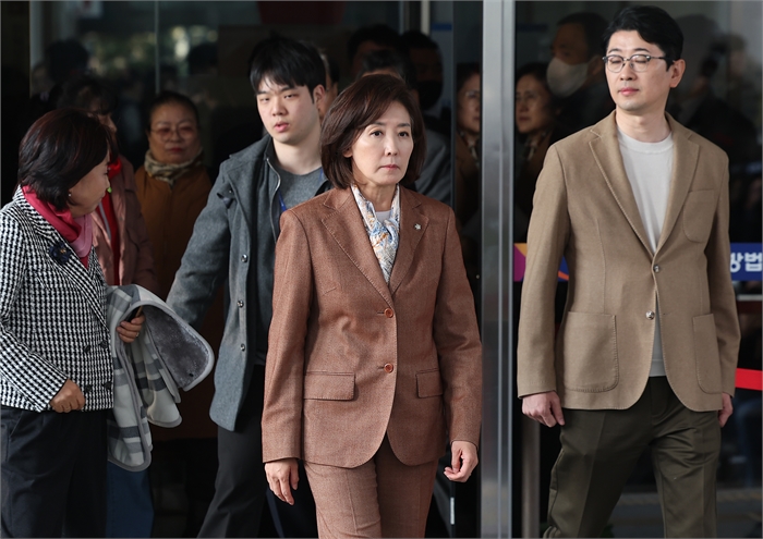 국민의힘 나경원 의원이 20일 서울 양천구 서울남부지방법원에서 열린 '국회 패스트트랙 충돌' 1심 선고 공판을 마친 후 나서고 있다. 재판부는 사건 당시 자유한국당 원내대표였던 나 의원에게 벌금 총 2천400만원을, 당 대표였던 황교안 전 총리에게 벌금 총 1천900만원을 선고했다. 현재 국민의힘 원내대표를 맡고 있는 송언석 의원은 벌금 총 1천150만원을 선고받았다.사진=연합뉴스