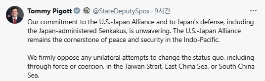 미 국무부 토미 피곳 수석 부대변인은 20일(현지시간) 소셜미디어에 게시한 글에서 “일본이 관할하는 센카쿠 열도(중국명 댜오위다오)를 포함한 미일 동맹과 일본 방위에 대한 우리의 공약은 확고하다”고 밝혔다.