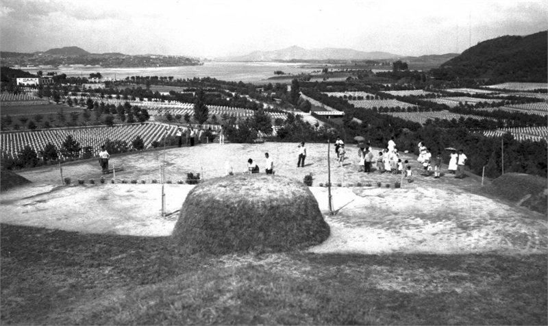 이승만 대통령의 유해가 묻힌 60년전의 동작동 국군묘지 일대. 사진은 장례직후 1965년 7월29일 찍은 묘지봉분과 참배하는 사람들. 묘소에서 국군들의 묘역들이 한눈에 바라보인다.사진=서울기록원/뉴데일리 캡처