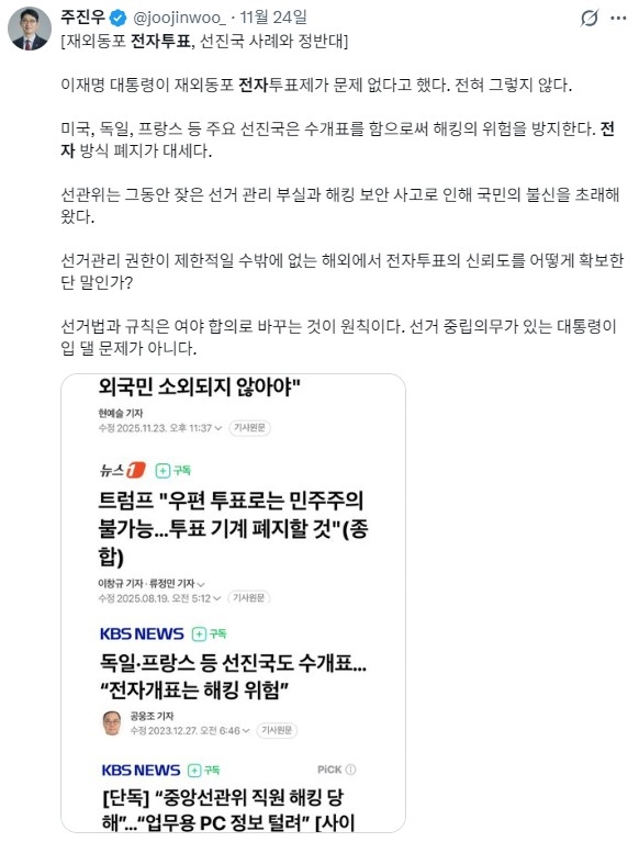 그는 편리성만 강조된 이재명 대통령 이하 여야 정치인의 해외 투표 확장은 지금까지 부정선거의 전형적인 온상이 된 의혹의 해외 투표 제도에 대한 전면 개혁을 강력히 요청한다고 말했다.