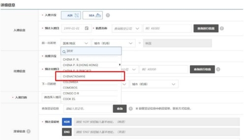한국 전자 입국 신고에서의 중국(대만) 표기.사진=대만 중앙통신사 캡처/연합뉴스