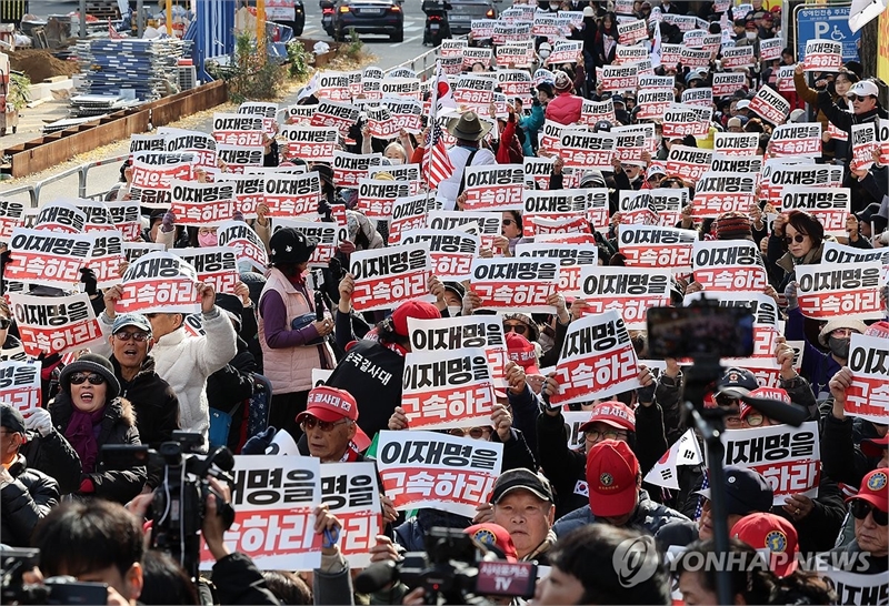 더불어민주당 이재명 대표의 위증교사 사건 1심 선고를 앞둔 지난해 11월25일 자유통일당이 서울 서초구 서울중앙지방법원 인근에서 이 대표 법정 구속 촉구 기자회견을 열고 있다.사진=연합뉴스