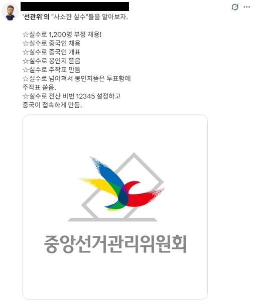 심지어 중공과 북한 개입 의혹을 제기하는 세력을 음모론이나 내란세력으로 공격하는 정치 프레임까지 동원했다. 이는 문제 해결이 아니라 은폐다.부정선거 의혹에 대한 선거 시스템의 취약성은 더 이상 부정할 수 없는 수준이다.