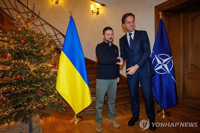 18일 브뤼셀에서 만난 젤렌스키 대통령과 뤼터 나토 사무총장.사진=연합뉴스
