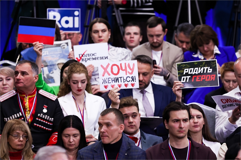 푸틴 대통령은 전선에서의 성과를 다룰 때는 러시아의 영웅 훈장을 받은 군인이 직접 설명하도록 하는 등 다양한 형식으로 소통했으며, 개인적인 질문에 대해서는 호위 차량 없이 모스크바 도로를 운전한다고 답하거나, 사랑에 빠졌느냐는 질문에 "그렇다"고 답하는 등 인간적인 면모를 보이기도 했다.