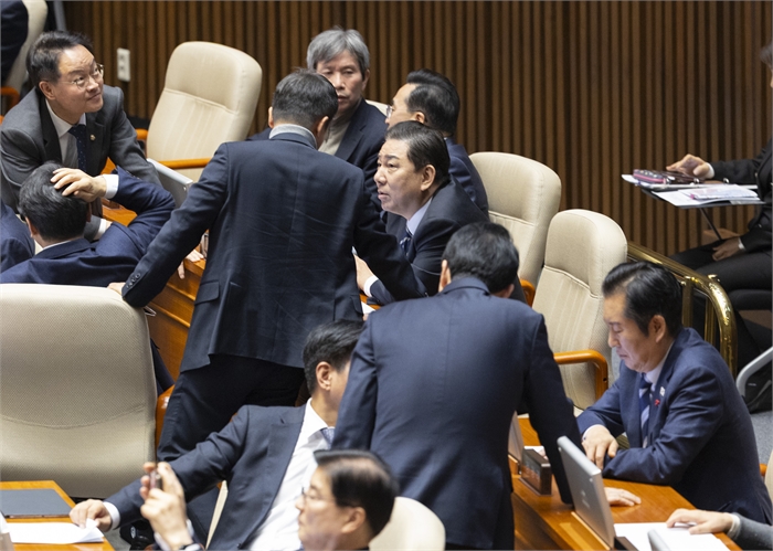 더불어민주당 정청래 대표와 김병기 원대대표를 비롯한 지도부들이 22일 국회에서 열린 12월 임시국회 본회의 도중 모여 대화하고 있다.사진=연합뉴스